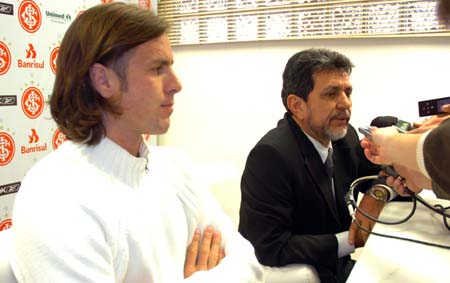 Zagueiro Marcão (E) e o vice-presidente de Serviços Jurídicos Luiz Antonio Lopes durante a entrevista coletiva no Beira-Rio