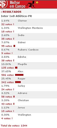 O meia Alex foi escolhido pela torcida colorada como o melhor jogador em campo na partida Inter 1x0 Atlético-PR, em votação realizada no site oficial do Inter. Clemer recebeu 506 votos (37.65%). Participaram da enquete 1344 internautas.