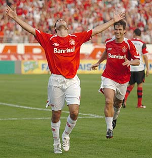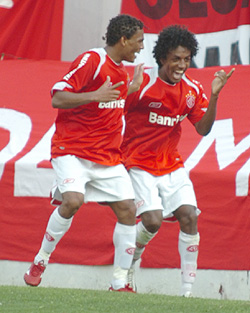 Roger (D) comemora com Adriano o segundo gol: Inter venceu a equipe carioca por 3 a 0