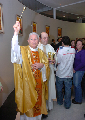 O capelão Leandro, o Frei Plácido e os padres José Antônio Heinznam, Geraldo Shommer, César Leandro Padilha, Rogério Luís Flores, dentre outros sacerdotes conduziram os rituais de benção da Igreja e do Altar. Ao final da missa, todos foram presenteados com camisas do Internacional.