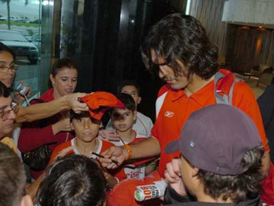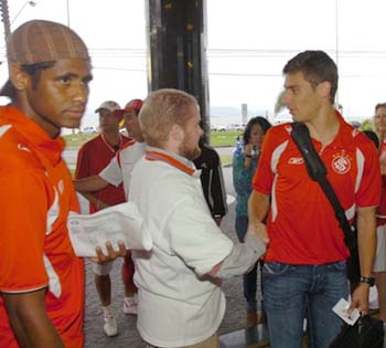A delegação colorada chegou a Florianópolis por volta das 17h desta quarta-feira. O grupo ficará concentrado em um hotel na Beira-Mar Norte até o jogo desta quinta-feira diante do Figueirense, válido pela 29ª rodada do Brasileirão. O Inter foi recebido no hotel por cerca de 30 colorados ávidos por contato, foto ou autógrafos dos jogadores. A maioria dos torcedores era formada por crianças e adolescentes. O mais procurado foi Fernandão, o capitão do time.