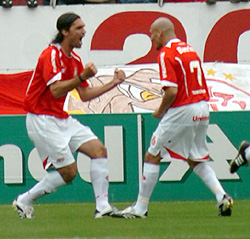 Fernandão (E) comemora com Guiñazu: Inter venceu por 2 a 0 no Beira-Rio