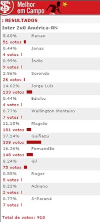 O volante Guiñazu foi escolhido pela torcida colorada como o melhor jogador em campo na partida Inter 2x0 América-RN, em votação realizada no site oficial do Inter. Guiñazu recebeu 338 votos (37.14%). Participaram da enquete 910 internautas.