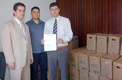 Presidente Demetrio Tafras (D) ao lado dos diretores da AGAP durante a doação das cestas básicas