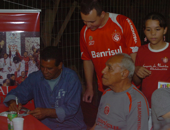 Ex-jogadores Valdomiro (E) e Milton Vergara (D, sentados) atenderam muitos pedidos de autógrafos e fotografias