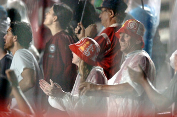 O Inter dominava a partida. Além do gol, empilhava chances com destaque para o atacante Nilmar, que deixava enlouquecidos seus marcadores. A chuva não dava trégua, mas o Inter pouco se importava e continuava marcando com eficiência, tocando a bola e jogando bem. Aos 39min, o juiz marcou falta de Orozco inexistente. O zagueiro colombiano foi na bola, mas mesmo assim ainda aplicou o cartão amarelo. Na cobrança, um minuto depois, Andrade chutou por cima.