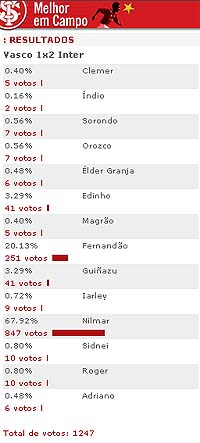 O atacante Nilmar foi escolhido pela torcida colorada como o melhor jogador em campo na vitória de 2 a 1 sobre o Vasco da Gama, em votação realizada no site oficial do Inter. Nilmar recebeu 847 votos (67.92%) pela sua atuação na partida de reestréia com a camisa colorada. Participaram da enquete 1247 internautas.