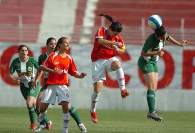 O time do Juventude era mais experiente, mas o jogo começou de forma muito equilibrada, com chances para ambos os lados. O Inter ameaçava nas jogadas de velocidade com suas duas atacantes, Karina e Carolina, enquanto que o Juventude alçava muitas bolas na área colorada, porém, sem muito perigo. O time da Serra Gaúcha cometia faltas em excesso. Aos 32min, Carolina foi derrubada na área: pênalti para o Inter. A centroavante Karina bateu com força no ângulo esquerdo, mas a goleira Renata defendeu.