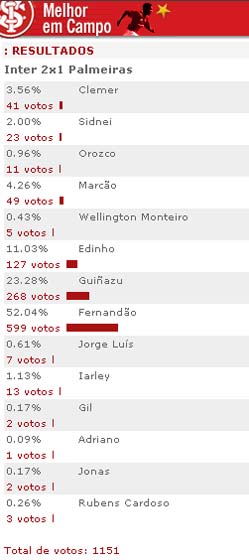 O meia-atacante Fernandão foi escolhido pela torcida colorada como o melhor jogador em campo na partida Inter 2x1 Palmeiras, em votação realizada no site oficial do clube. Fernandão recebeu 599 votos (52.04%). Participaram da enquete 1151 internautas.