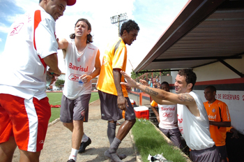 Em um animado recreativo, o último do ano, os jogadores enfrentaram um forte calor comum à esta região do País. Apesar disso, não se pouparam e jogaram com intensidade o ?rachão?, como eles chamam. Os dois times foram compostos da seguinte forma: de um lado, vestindo coletes brancos, Guto, Sidnei, Jorge Luís, Marcão, Jonas, Roger, Magrão, Orozco, Clemer e o preparador físico Eduardo Silva, que completou o time. No outro lado, com a camisa de treino laranja atuaram Guiñazu, Fernandão, Rubens Cardoso, Adriano, Gil, Maycon, Danny Morais, Wellington Monteiro, Iarley e Renan.