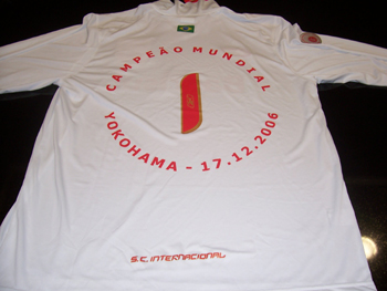 Torcedor colorado, chegou a camisa comemorativa ao primeiro aniversário da conquista do Mundial Interclubes Fifa pelo Inter. Além de ter manga longa, ser branca, como a camisa usada pelo time no histórico confronto contra o Barcelona no Japão, tem um selo alusivo ao primeiro aniversário do título. A camisa já está à venda nas lojas InterSport e nas demais lojas do ramo ao preço de 179,90 reais. Nas costas da camisa, o número 1 e a inscrição Campeão Mundial Yokohama - 17.12.2006.
