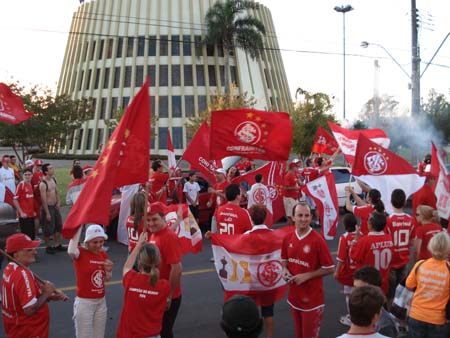 Durante uma hora, cerca de 200 carros desfilaram com orgulho as bandeiras do Internacional pelas principais ruas da cidade. A carreata culminou em frente à ?Igreja da Pipa? (Igreja São Bento). No local, centenas de torcedores cantaram sem parar o hino do Clube e comemoraram novamente o gol que deu a vitória ao Internacional há um ano. A mobilização emocionou o presidente do grupo Maurício Burmann Lopes. ?Parece que voltamos àquele momento em que tomamos conta das ruas de Bento no ano passado. Esse título será comemorado dessa forma para o resto de nossas vidas?, declarou em meio à comemoração.