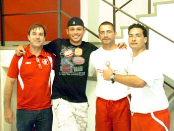 Edinho entre o médico Carlos Poisl (E) e os fisioterapeutas Rodrigo Rossato e Mauren Mansur