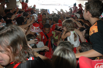 Sedentos por autógrafos e fotografias com os jogadores, torcida cerca Nilmar