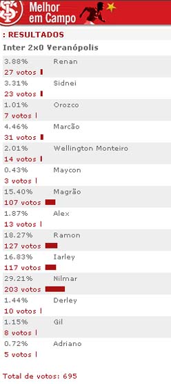 O atacante Nilmar foi escolhido pela torcida colorada como o melhor jogador em campo na partida Inter 2x0 Veranópolis, em votação realizada no site oficial do clube. Nilmar recebeu 203 votos (29.21%). Participaram da enquete 695 internautas.