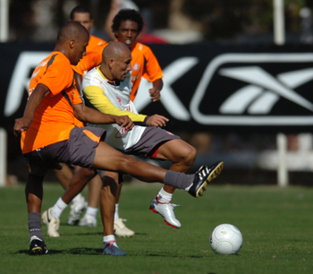 Autor de um dos gols do treino, Alex avança sob marcação de Índio