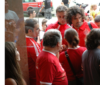 Renan (no alto, à E) e Fernandão (D) atendem colorados na chegada ao hotel