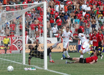 Aos 9min, Wellington Monteiro tabelou, entrou na área e chutou no corpo de um zagueiro. Aos 12min35seg, a bola sobrou para Tiago Rodrigues, em completo impedimento na área. Ele matou a bola e chutou para fazer o gol, mas o juiz acertadamente marcou a infração e anulou. Guiñazu se destacava na marcação, mas também no apoio no ataque. Como ocorreu aos 14min em uma grande arrancada que foi até a área, mas a zaga conseguiu afastar. Aos 18min30seg, Cláudio Millar cobrou falta com perigo para a área e Renan salvou com um tapa para escanteio.