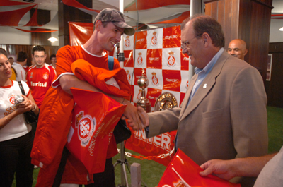Além de conhecer novo Espaço do Beira-Rio, sócio (E) recebe prêmio campeão do mundo das mãos do presidente colorado