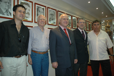 Da esq. para a dir.: Sergio Barrios, Arthur Dallegrave, Miguel Lifschitz, Jorge Biglione e Emídio Ferreira na sala de reuniões da presidência do Inter, cercados pelos quadros de ex-presidentes e troféus colorados