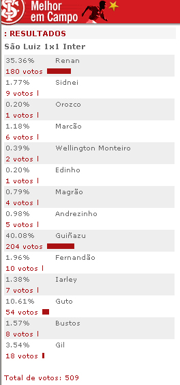 O argentino Guiñazu foi escolhido pela torcida colorada como o melhor jogador em campo na partida São Luiz 1x1 Inter, em votação realizada no site oficial do clube. Guiñazu recebeu 204 votos (40.08%). Participaram da enquete 509 internautas. Confira abaixo o resultado completo da enquete: