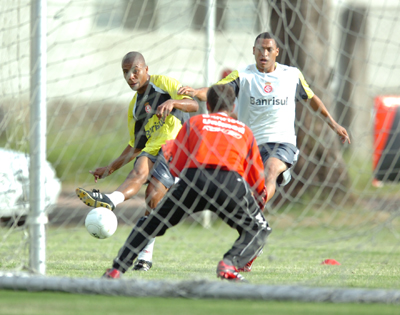 Guto (E), autor do gol da última quarta, chuta sob a marcação de Titi (D) no treino