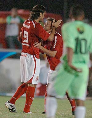 Fernandão (E) comemora com Alex: capitão fechou a goleada na Paraíba com uma perfeita cobrança de pênalti
