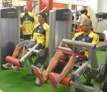Guiñazu (E), Índio (C) e Edinho (D) na academia do vestiário: Inter deve ter força máxima contra o Guarany-BA