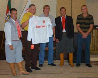 Jefferson Goulart (E) e Paulo Bellarmino (2º da dir. para esq.) presenteiam com camisa oficial do Inter os sócios da Artesanato Morungava