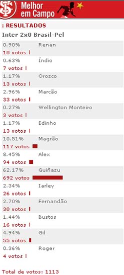 O volante Guiñazu foi escolhido pela torcida colorada como o melhor jogador em campo na vitória de 2 a 0 sobre o Brasil-Pel, em votação realizada no site oficial do clube. O argentino recebeu 692 votos (62.17%). Foi a terceira vez neste ano que o jogador venceu a enquete 'Melhor Campo'. Contra o Nacional-PB e São Luiz, Guiñazu já havia tido a preferência de votos. Participaram da enquete do jogo Inter 2x0 Brasil-PEL 1113 internautas.