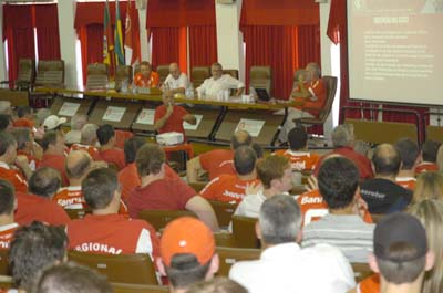 Passado o almoço, as atenções se voltaram para o Salão de Eventos do Conselho Deliberativo. Os vice-presidentes Gelson Pires (Comunicação Social), Jorge Avancini (Marketing) e Roberto Siegmann (Serviços Especializados) deram as boas-vindas aos representantes dos consulados e começaram a explanar as idéias referentes ao plano de arrecadação de 100 mil sócios até o dia 4 de abril de 2009. "O sócio é quem constrói a história do Internacional, sempre foi assim. Ele será o protagonista mais uma vez, nesse marco dos cem mil sócios", declarou o vice-presidente Roberto Siegmann.