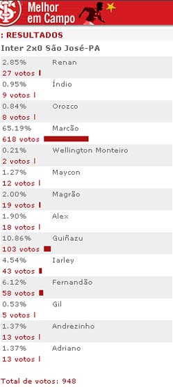 O zagueiro Marcão foi escolhido pela torcida colorada como o melhor jogador em campo na vitória de 2 a 0 sobre o São José-PA, em votação realizada no site oficial do clube. Marcão recebeu 618 votos (65.19%). Participaram da enquete 948 internautas.