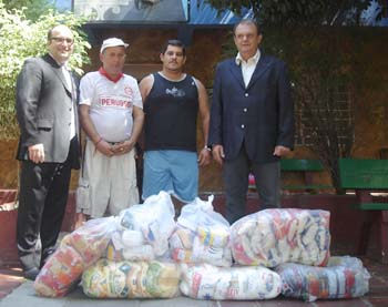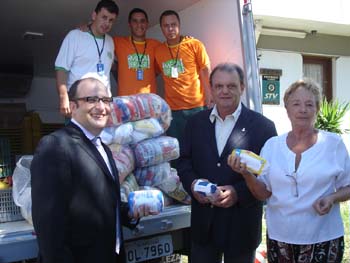 Vitorio Piffero (C) entregou os alimentos para a presidente da Casa Santa Rita de Cássia, Irene Abrantes (D)