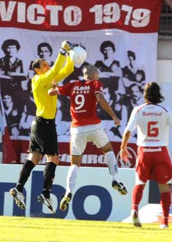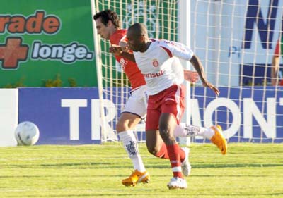 Iarley, atuando quase como um ponta-esquerda, levava perigo ao time da casa, que tinha dificuldades em segurar o atacante colorado.