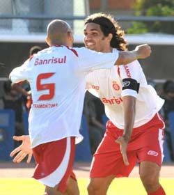Guiñazu (E) comemora com Fernandão seu segundo gol pelo Inter