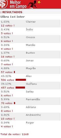 O meia-atacante Alex foi escolhido pela torcida colorada como o melhor jogador em campo na vitória de 4 a 1 sobre a Ulbra, em votação realizada no site oficial do clube. Alex recebeu 506 votos (43.32%). Também pudera, o jogador marcou dois gols em Canoas e chegou à vice-artilharia do Gauchão com nove gols. Participaram da enquete 1168 internautas.
