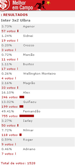 O meia-atacante Fernandão foi escolhido pela torcida colorada como o melhor jogador em campo na partida Inter 3x2 Ulbra, em votação realizada no site oficial do clube. Fernandão recebeu 755 votos (49.41%). Participaram da enquete 1528 internautas. Confira abaixo o resultado completo da enquete: