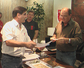 Tesoureiro Airton Garcia entrega a doação ao presidente Vitorio Piffero