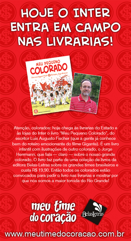 O livro 'Meu Pequeno Colorado', do escritor Luis Augusto Fischer e com ilustrações de Jorge Hermann, já está nas livrarias. A obra faz parte da coleção dos grandes clubes brasileiros, da editora Belas-Letras, e chega ao mercado com o preço de R$ 19,90. Acesse http://www.meutimedocoracao.com.br/ e saiba mais!
