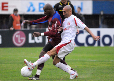 No meio-campo, o argentino Guiñazu (E) rouba mais uma bola do Caxias com sua marcação implacável