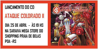 O Inter realiza nesta sexta-feira (25/04), às 19h, a sessão de autógrafos de lançamento do CD Ataque Colorado 2. O álbum será autografado na Saraiva Mega Store, no 2º andar do Shopping Praia de Belas, pelos músicos colorados da banda Maria do Relento, Kako Kanidia, Peppe Joe e Guilherme Barros, e pelo ex-presidente campeão mundial Fernando Carvalho.