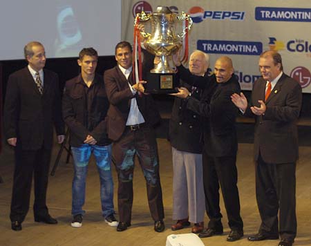 Da esq. para dir.: Giovanni Luigi, Alex, Índio, Arthur Dallegrave, Guiñazu e Vitorio Piffero com a taça do Gauchão 2008 no palco do Teatro São Pedro