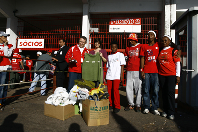 O confronto entre Internacional e Vasco foi uma oportunidade para um ato de solidariedade. O Comitê de Ação Solidária e a Organização Não ? Governamental Centro de Apoio ao Portador de Anemia Falciforme receberam alimentos não perecíveis para as vítimas do ciclone extra-tropical que atingiu o Estado há uma semana. Ao todo, 16 voluntários e funcionários do clube participaram do evento, recebendo doações de alimentos e agasalhos nos portões de acesso ao estádio.