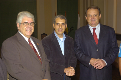 Presidente da FECI, Jorge Vieira da Cunha (E), prefeito José Fogaça e o presidente colorado Vitorio Piffero em mais uma iniciativa de sucesso entre prefeitura de Porto Alegre e o Inter