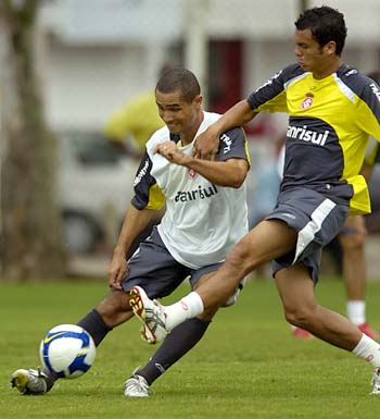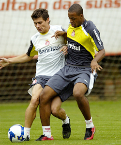 Maycon (E) e Ramon treinam duro no suplementar do Beira-Rio