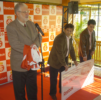 Presidente do Asilo Padre Cacique, Gildo Milman (E), recebeu o cheque simbólico de 100 cestas básicas da Reebok