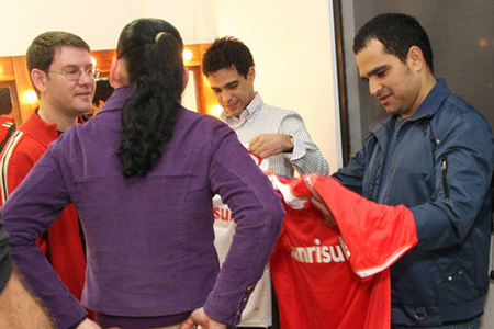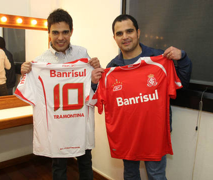 A dupla sertaneja Zezé di Camargo & Luciano foi homenageada pelo Internacional na noite desta quarta-feira (11/6), após show realizado no Teatro do Sesi, em Porto Alegre. Os cantores ganharam camisas oficiais do clube das mãos do cônsul cultural e músico Kako Kanidia, que ressaltou que o Inter não esquece de quem faz cultura e história pelo Brasil. A dupla, por sua vez, ficou bastante tocada com a homenagem.