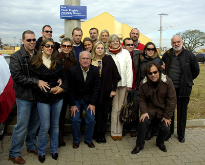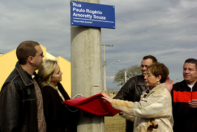 Familiares e amigos posam em frente à placa da rua com nome de Paulo Rogério Amoretty Souza