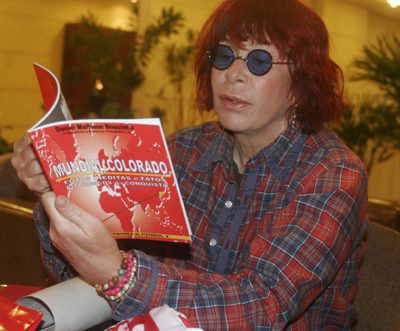 Rita Lee admira a camisa retrô colorada que ganhou na passagem pela cidade