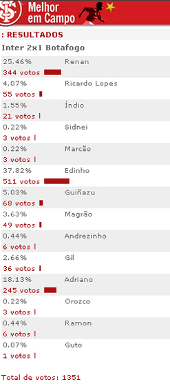 O volante Edinho foi escolhido pela torcida colorada como o melhor jogador em campo na partida Inter 2x1 Botafogo, em votação realizada no site oficial do Inter. Autor de uma golaço de fora da área, Edinho recebeu 511 votos (37.82%). Participaram da enquete 1351 internautas.